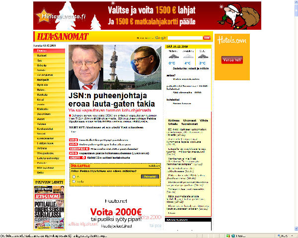 | Nettisanomat 2010/01/07 - Ilta-Sanomat: Viihde: Jo viikko koomassa - Terror is the price of support for despots and dictators - Ilta-Sanomat kertoo taiteilija Juhani Palmun sairastuneen legioonalaistautiin - Egypt's complicity in Gaza's siege underlines the role of western support for such regimes in the spread of war - Seumas Milne The Guardian - Uusi vuosikymmen: 02.01: Ammuttu susi - 04.01: Törmännyt juna - New Security Measures - 828 m. - Paljon verta! - Islanti: Vanhasen ja Kataisen päätös voi tulla vielä kalliiksi suomalaisille veronmaksajille, vai voiko? - Uusi Suomi: ”Tuomioja kritisoi asehullujen hokemaa. - Matti Vanhanen . Jyrki Katainen - Erkki Tuomioja - Surmapäivän kuvia. Raketti kuuhun. Uintireissulla. Vakavat kasvot. Munkkikahvit ja -kaakaot - Kiinnostavat lehdet. "Paatero pahoittelee ampumista" - MTV3:n seitsemän uutiset toimittaja Johanna Tuuri suorana Sellosta, studiotoimittajat ja rikosylikomisario Jukka Kaski ja poliisiylijohtaja Mikko Paatero - "Afganistanissa kuolleet CIA:sta" - Salama-Jack (1994). Nelonen klo 20:39. Hulvaton arvio Keskisuomalaisessa: Marko Ahonen. "Paul "Krokotiilimies" Hogan - Raketti ja kuu. Five dead in Finland after gunman goes on shopping centre rampage Guardian - Finnish gun laws under fire Guardian - Tuuli käy heidän ylitseen - Sarjakuva: Matti ja Mikki. Matti Vanhanen paljastaa eronsa todellisen syyn! - Lähteet: Ilta-Sanomat: "Mystinen mielenmuutos" keskiviikkona 2009-12-30. Kuva (Peter Jansson). Aku Ankka: "Mikki Hiiri. Katoava konna" keskiviikkona 1990-02-14. (Sarjakuva Walt Disney). - Kissan kiinnostus. Kuvia - Harhaanjohtavaa tietoa tiomersaalia sisältävän rokotteen sivuvaikutusriskeistä lapsille ja sikiölle - Onko meillä syytä olla huolissamme? - Sensuuri iski oikeusturvajärjestö EOK:n keskusteluihin - Riikka Söyring, Maths Berlin, Jaana Pedersen, Jarmo Juntunen- Hamid Karzai -Tsunami 2004 muisto: Sunnuntaina 26. joulukuuta 2004, tapaninpäivänä, kello 08.55 Suomen aikaa avasin television. - After the 2004 tsunami: rebuilding lives, salvaging communities link. - Kuvat. Rälläkkä eli Pelastusarmeijan joulupata - Kissa ihmettelee lunta - Joulupukki kylän raitilla eli Rami K. matkalla tupiin.Vanhasen lähtöilmoitus- 12 kuvaa vuoden lyhimpänä päivänä 2009 - Hyvän ja pahan kosketus - Copenhagen's failure belongs to Obama - US forces mounted secret Pakistan raids in hunt for al-Qaida - Kuvasarja. Venäjän NTV MIR- kanava kertoo Tukholman ja Oslon siirtyneen 4G-aikaan. Poliisi Tampereella ja Kauhajoella. Poliisiylijohtaja ja ministeri Helsingissä - Tärkeä henkilö: Heidi Hautala - Peter von Bagh: ”Avatar ei tuota sellaista mielihyvää ...” - Suomen Afganistan-joukot auttavat USA:n hyökkäystä Iraniin - Wincapita: Hypnoosia ja ammattitaitoa - Alexander Stubbkaan ei kovin innostunut! - Neljä kuvaa 3. adventtisunnuntaina, Lucian päivänä: Kirkko - kauppa - kokous - kylpy. - Wincapitan kokous - Kuva. Obama: "För Alfred Nobel: skål!" Rauhan Nobel-palkinto 2009. - Julkisen sanan neuvosto antoi vapauttavan päätöksen Ylen Matti Vanhasen lautoja käsittelevästä ohjelmasta. - Nettisanomat 10 vuotta. Kansikuvat Itsenäisyyspäivän aikoihin. - Kuvasarja. Vastakohtia Vapaudenkadulla: Lapsikronikka - Lähdemme sotaan, kaikilla Jumalan lapsilla on aseita - Kirkko - Kauppa. Keski-Suomi. Jyväskylä. Kaupunginkirjasto. Vapaudenkatu. Lasten oikeuksien vuosipäivän kirjanäyttely. Elokuvakerho Toveruuden Neljä naurettavaa naapuria eli Duck Soup (1933). Marx-veljekset. Minnan sali. Valaistu kaupunginkirkko. Sokos-tavaratalon parkkitalo.- Kuva 6.12.2009. Harmaasta sineen. - Nettisanomat torstai 07.01.2010 - etusivu - kuva - kuvat - pertti manninen - Luettelo - nettisanomat - 12.fi - Lakisanomat - N:o 1095. |