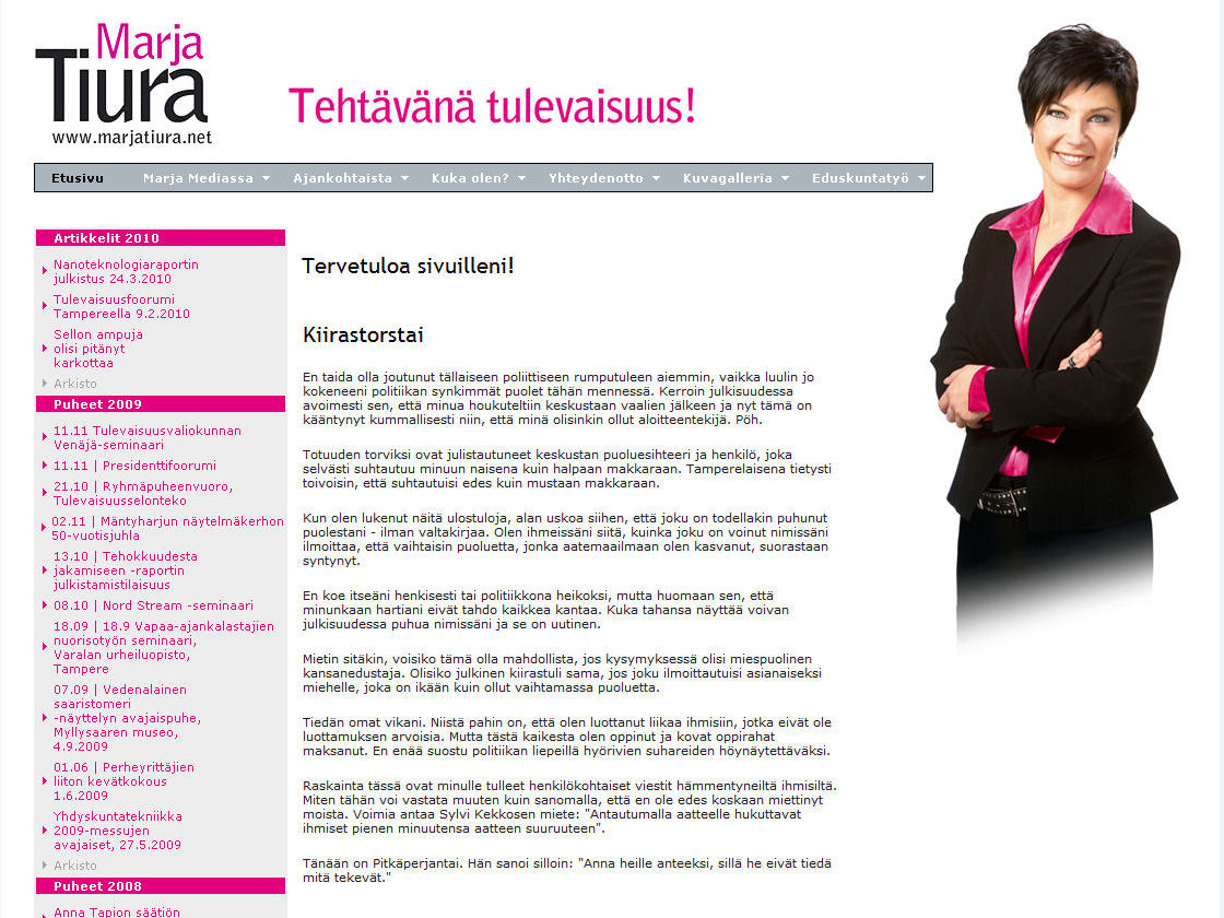 Tiura www.marjatiura.net Tehtävänä tulrvaisuus! Etusivu Marja Mediassa Ajankohtaista Kuka olen? Yhteydenotto Kuvagalleria Eduskuntatyö Artikkelit 2010 Nanoteknologiaraportin julkistus 24.3.2010 Tulevaisuusfoorumi Tampereella 9.2.2010 Sellon ampuja olisi pitänyt karkottaa Arkisto Puheet 2009 11.11 Tulevaisuusvaliokunnan Venäjä-seminaari 11.11 | Presidenttifoorumi 21.10 | Ryhmäpuheenvuoro, Tulevaisuusselonteko 02.11 | Mäntyharjun näytelmäkerhon 50-vuotisjuhla 13.10 | Tehokkuudesta jakamiseen -raportin julkistamistilaisuus 08.10 | Nord Stream -seminaari 18.09 | 18.9 Vapaa-ajankalastajien nuorisotyön seminaari, Varalan urheiluopisto, Tampere 07.09 | Vedenalainen saaristomeri -näyttelyn avajaispuhe, Myllysaaren museo, 4.9.2009 01.06 | Perheyrittäjien liiton kevätkokous 1.6.2009 Yhdyskuntatekniikka 2009-messujen avajaiset, 27.5.2009 Arkisto Puheet 2008 Anna Tapion säätiön 50-vuotisjuhla 14.10 | Finlaysonin kirkko, 13.10.2008 14.10 | Ajankohtaiskeskustelu tietoyhteiskunnan tilasta, Eduskunta, 8.10.2008 23.09 | Tasauspäivä, Lempäälän Ideapark 22.9.2008 03.09 | Avajaispuheenvuoro, Turvallisuusmessut 03.09.2006 Arkisto Voit lukea täältä päiväkirja-merkintöjäni, joissa pohdiskelen päivittäisiä tapahtumia kuin myös ajankohtaisia ilmiöitä Marjan Blogi |