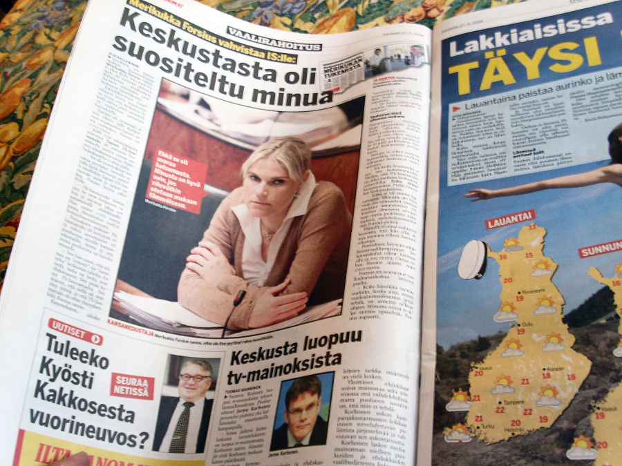 It has transpired KMS was established in the Centre party’s own headquarters. Things took a turn for the worse after it emerged KMS was backing the building of a shopping centre called Ideapark outside Helsinki, the capital, and that Mr Vanhanen had briefly mentioned that Ideapark would be a good thing in a blog.