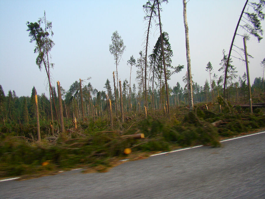 ![]() "Suomessa kesällä 2010". Katkenneet puut on raivattu pois ajotieltä. Tolpistaan pudonneet sähkökaapelit ovat vielä puiden alla. Kuva: Keski-Suomi. Konnevesi. Tie n:o 69. Sunnuntai 2010-08-08 klo 19:10. Pertti Manninen. |