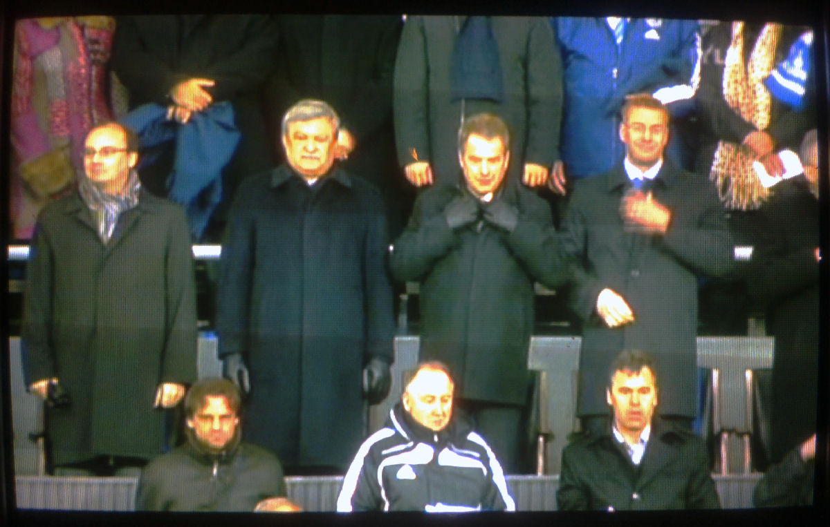 | Lumiukko? - Palloliiton puheenjohtaja Sauli Niinistö kuuntelee kansallislaulua Olympiastadionilla tiistaina 2010-10-12 klo 18:27. |