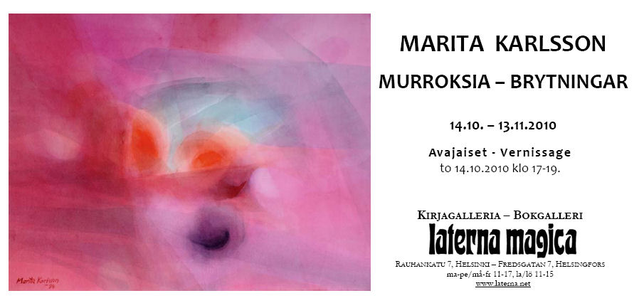 Marita Karlsson Murroksia - Brytningar 14.10. - 13.11.2010 Kirjagalleria - Bokgalleri laterna magica Rauhankatu 7, Helsinki www.laterna.net | Palkittu