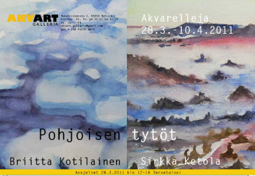 ![]() Tällä kertaa esittelemme "POHJOISEN TYTTÖJEN" (Sirkka Ketola - Briitta Kotilainen) herkkiä akvarelleja. Galleriamme on avoinna ti,to,pe 11-17, ke 11-19, la-su 11-16. AKVART galleria |