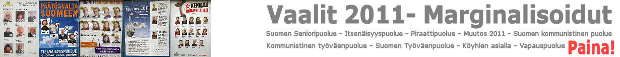 | Kommentti: Tämä ohessa oleva banneri on vienyt maanantaista 2011-04-11 alkaen noin 20 000 sivulta tässä ohessa julkaistavalle bannerisivulle (n.o 2), jossa tuotiin esille tämä pienpuolueiden syrjintä. Pertti Manninen. | ||||||