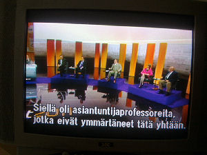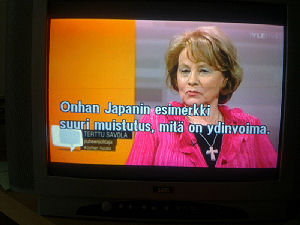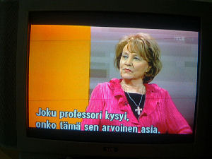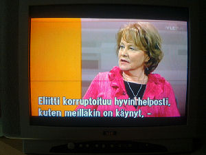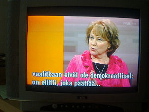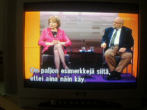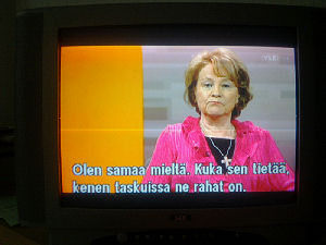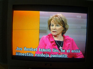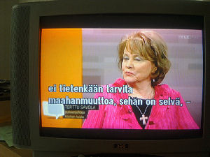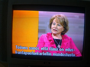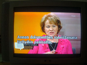 | Terttu Savolan mielipiteitä Ylen vaalitentissä torstaina 2011-03-24, reilusti ennen vaalipäivää. Tekstit seuraavan päivän tekstitetystä lähetyksestä. Kuvat mobikameralla lähes kaiken tallentaen. Muistini mukaan puheenjohtaja Savola antaa kerjäläisellekin lantin, vaikka teksti onkin jäänyt pois. Pertti Manninen. | |||