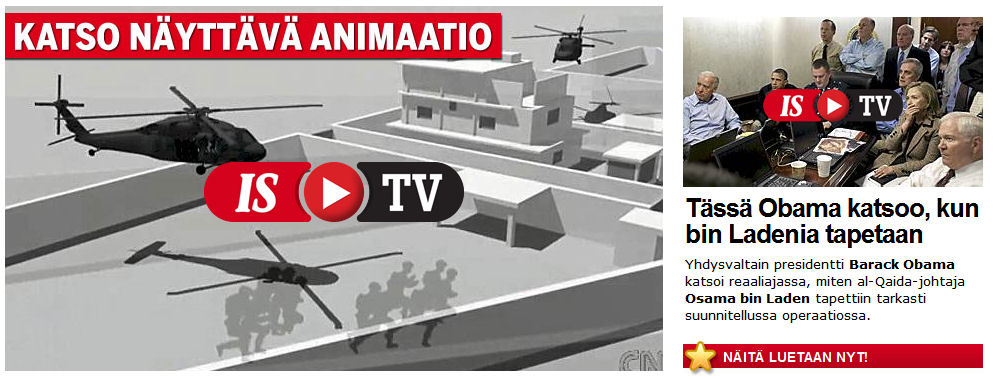 Katso näyttävä animaatio. IS TV. IS TV. Tässä Obama katsoo kun bin Ladenia tapetaan. Yhdysvaltain presidentti Barack Obama katsoi reaaliajassa, miten al-Qaida-johtaja Osama bin Laden tapettiin tarkasti suunnitellussa operaatiossa. Näitä luetaaan nyt! http://www.iltasanomat.fi/ |