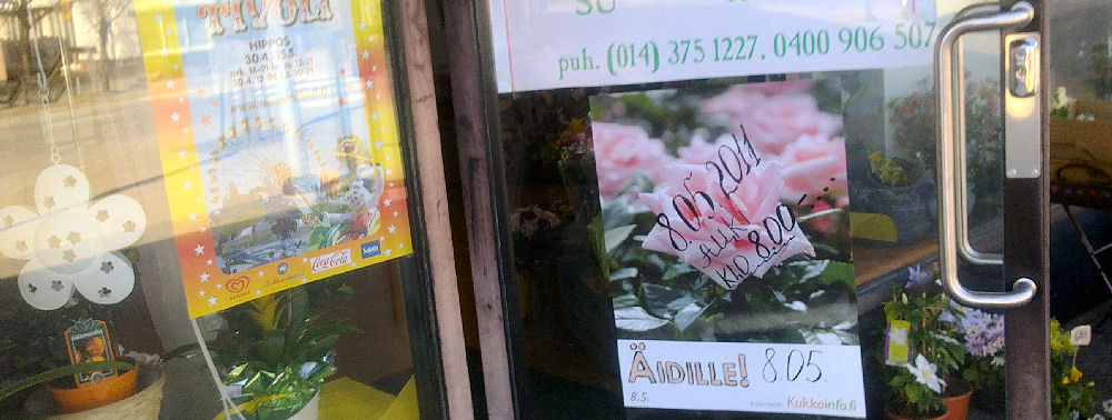 2005 Nettisanomat tiistaina 10. toukokuuta 2005. Kuva: Kukka äidille sunnuntaina 08.05.2005. Kuva: Pertti Manninen. Muistikuva Jukka Kajavan kirjoituksesta sen jälkeen kun joku suomalainen europarlamentaarikko-äiti intoili, että hän antaisi poikansa lähteä ilomielin sotaretkelle, jos tämä poika niin itse haluaisi. Kajavan lakoninen toteamus: "Onneksi hän ei ole äitini, oma äitini kyllä toppuuttelisi". http://www.nettisanomat.com/2005/05/10/kuvakukkaaidille.htm 2006 "Ensin punainen ruusubegonia äidille Ruusupisteestä ja sitten huimaa pyöritystä Suomen Tivolissa. Olisipa sää näin helteinen vielä sunnuntaina!" 10.05.2006 toukokuun keskiviikkona klo 16.23 Kuva: Pertti Manninen. Jyväskylä. Isompana tulossa! http://www.nettisanomat.com/2006/05/11/etusivu.htm 2007 Äideille kimput, ruukkukukat, asetelmat Ruusupuusta - Suomen Tivoli ark. 16-21 la,su 12 -21. http://www.nettisanomat.com/2007/05/11/etusivu.html Äidin rakkaus. Helsinki. Rautatientori. Kuva lauantaina 2006-03-31 Pertti Manninen. http://www.nettisanomat.com/2007/05/11/etusivu.html#aidinrakkaus