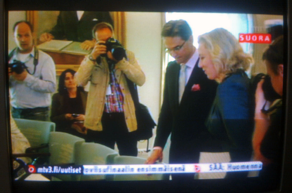 ![]() Kuva: "Hallitustunnustelija Jyrki Katainen vetää luontevan kohteliaasti tuolia Jutta Urpilaiselle ja varmistaa sen, että daami istuu mukavasti ja vasta senjälkeen istahtaa itse ja aloittaa kehumisen." MTV3. SUORA. 2011-05-11 klo 19:01. |