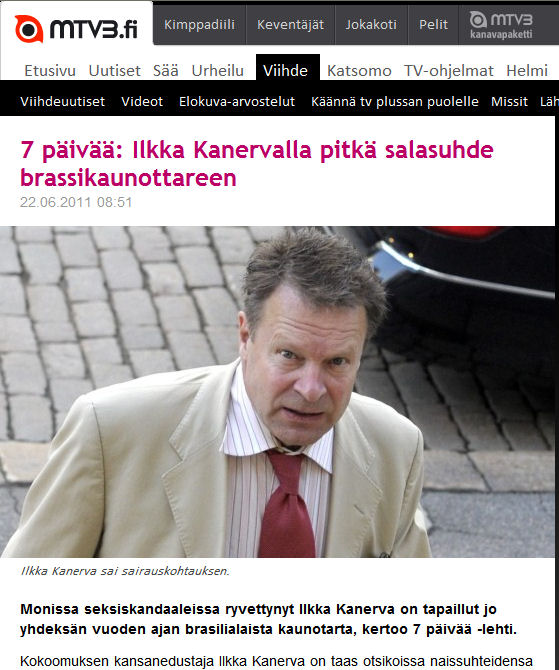 Juhannusaatto 2011-06-24 Helsingin Sanomat ja käräjäoikeus. Vahvemman oikeutta. Tapaus Lyly Rajala. Seksuaalinen häirintä. HS- kunnianloukkaus Kesäkuu 23, 2011 Tämä kirjoitus ei ota kantaa siihen onko ex-kansanedustaja katsellut naisten rintoja eduskunnan hississä tai käyttäytynyt Helsingin Sanomien kirjoituksen väittämällä tavalla. Tässä ihmetellään sitä, että näihin seikkoihin ei saatu oikeudessa sen enempää selvyyttä kuin, mitä kirjoituksessa väitettiin, koska yhtään alkuperäistä todistajaa ei ollut oikeudessa kuultavana. Sen sijaan Helsingin Sanomat oli onnistunut löytämään muita naisia, jotka väittivät Rajalan tökänneen sormella mahaan ja jopa suudelleen luvatta. Suutelijatodistaja taisi olla Sanomakonsernin toisen lehden ex-toimittaja. Tästä en nyt ole ihan varma ja asia pitää tarkistaa netistä myöhemmin. LAINAUS ”Oikeuden