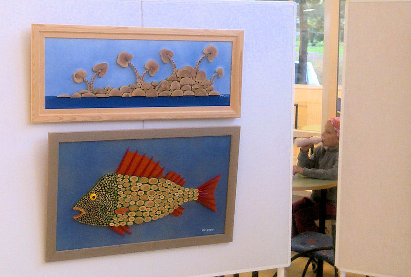 "Näyttelyssä." Taiteilija Koivumäen teoksia Laukaan kirjastossa. Kuva Pertti Manninen torstaina 2011-09-15. |