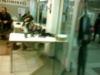 "Kiven hehku". Kari Alonen 2010. Keski-Suomi. Jyväskylä. Matkakeskus. Tiistai 2011-12-13 klo 16:05. Henkilöt ovat sattumalta kuvassa. Mobikuva: Pertti Manninen.