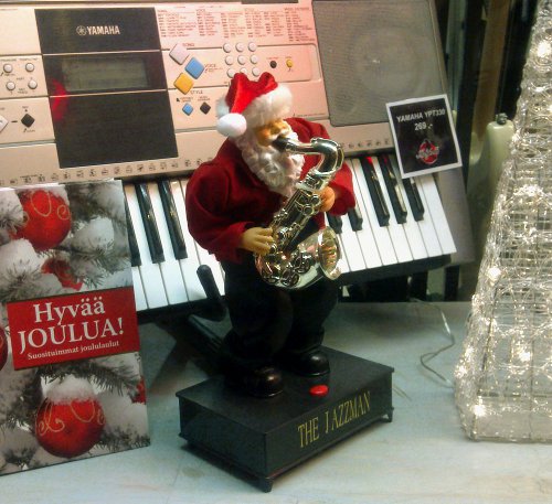 "The Jazzman"![]() "The Jazzman". Musiikkikauppa MusikanttiJyväskylässä on koristanut näyteikkunansa todella jouluisasti. Tässä pieni yksityiskohta saksofonia soittavasta joulupukista Hyvää Joulua- laulukirjan nuotteja sovitellen, ehkä. Keski-Suomi. Jyväskylä. Väinönkatu Harjun kupeessa. Perjantai 2011-12-16 klo 17:19. Pertti Manninen. |