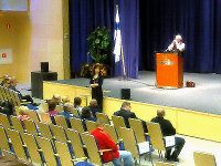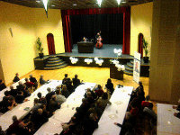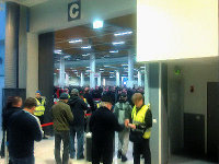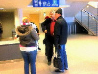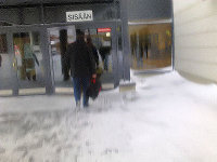 ennen presidentinvaaleja 2012. Kuvia lauantaina 2012-01-14 klo 11-15. Keski-Suomi. Jyväskylä. Tourujoki - Rajakatu - Harjukatu - Paviljonki - Irish Bar - Aalto-sali - Våinönkatu. 1. Tourujoki on jäätynyt.2. "Liskopatsas", Kari Allonen, ammattikorkeakoulun ja Alvar Aallon suunnitteleman ensimmäisen (?) asuinkerrostalon kupeessa.3. Kauppamiesten näköispatsas. 4. Harjun kioski on muuttunut kioski "55":ksi koulukompleksin vierellä. 5. Jyväskylän Paviljonki ja korkeutensa saavuttanut Sokos-hotelli. 6. Sisään. 7. Teuvo Hakkarainen hymyilee aulassa keskustelun välistä, pyynnöstä. 8. Rompepäivät vetävät väkeä niin, että on erehtyä sinne. 9. Toimi Kankaanniemikin on saapunut Timo Soinin puhetilaisuuteen. 10. Yleisön joukossa on julkinen Pekka Haaviston,"kakkosen", kannattaja.11. Pieni kuulija ei innostu Soinin puheesta, jossa tämä mm. kertoo menettäneensä ulkoministerin tai valtiovarainministerin paikan pitäessään kiinni periaatteistaan. 12. Pentti Varkila soittaa huuliharpullaan "Finlandian" tilaisuuden alussa. Soini istuu ja Anitta Kangas seisoo. Paikalla on varmaankin parisataa kuulijaa, kun nonstop-kävijätkin lasketaan mukaan. 13. Paviljongin yläaulassa kahvittelusta tullessa törmää Jaakko Valon vuonna 2006 valmistuneeseen "Kulta-aikaan", vaneri, akryyliväri ja lyöntikulta.14. Rompetorilta Isä on löytänyt kaipaamansa pakoputken.15. Irish Barin lämpöisessä tunnelmasssa voi vain muistella, kuinka lämmintä ulkoterassillakin kerran kesällä oli kun siellä nyt talven viima puhaltelee.16. OHOH- ILTASANOMAT repäisee ainakin kunnon otsikot, kun se taas kiihdyksissään unohtaa "tutkimuksen" virhemarginaalit! 17. Paavo Lipposen vaalimainokset lumessa Aalto-saliin houkuttelemassa.18. "On the Sunny Side of the Street" vain soluu taitureiden esittämänä, pianisti Marian Petrescu ja basisti Mihai Petrescu. Sali on täynnä, ylhäällä parvella on kyllä hyvin tilaa myöhästyneellekin. 19. Puolueen puheenjohtaja, valtiovarainministeri Jutta Urpilainen kehuuPaavo Lipposta ja muistuttaa kuinka gallupit nujerrettiin viime eduskuntavaaleissa. "Tasavallan presidentin virka ei ole mikään ulkosuhteiden harjoittelupaikka". 20. Kahvia tarjoilemassa ihan samannäköinen nuori nainen, joka Asunnottomien yön iltatunneilla tarjoili hernekeittoa ulkona Kompassin nurkilla viime syksynä.21. Kahvijonot. 22. Rompetorilta tai sitten muualta tullut sivuvaunuilija pyörähtää Väinönkadulla. 23. Pieni koira näkee toisen pienen koiran kadun aurinkoisella puolella. 24. Söpöliinille on laitettu töppöset jalkaan tässä kahdeksan asteen pakkasessa, joka tuntuu kovin kylmältä viimaisina hetkinä. - Mobikuvat: Pertti Manninen. Isonna! |