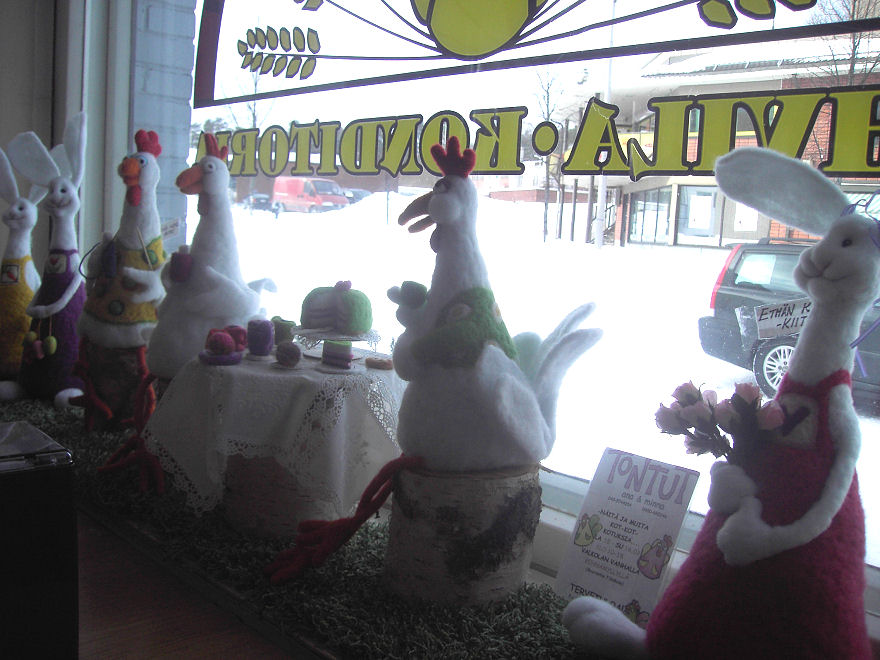 | 2008-03-27 Puput ja kanat tarkkailevat kahvilan pöydissä istuvia ihmisiä. Laukaa. Herkkukondis tänään torstaina 2008-03-27 neljän aikoihin. Kuva: Pertti Manninen. PS. Sulokkeja myydään Laukaantien Kädenjälki-liikkeessä. Isonna! |